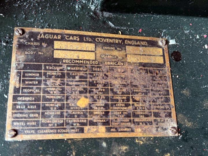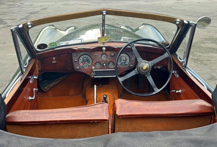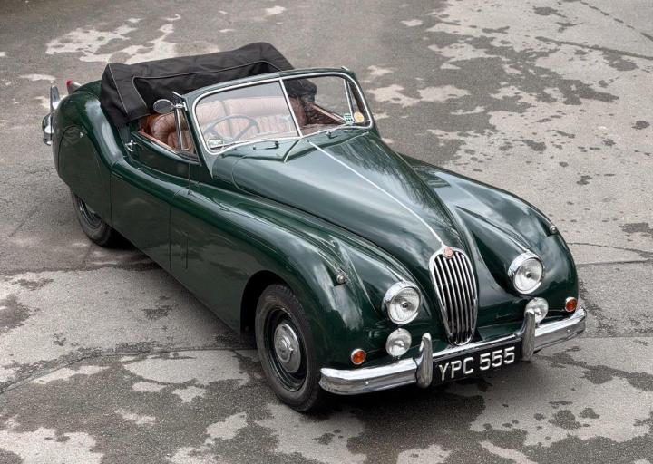 A totally correct and exceptionally original example of a rare UK market, RHD drophead, supplied new in 1955 by The Woodcote Motor Co, Epsom. Sound condition, cosmetically mature and appealing, retaining original, mellowed tan leather interior, and of nicely understated specification with disc wheels and spats. The paint shows its age in a quite charming way, the chrome work is very good to excellent, and the overall appearance is seductively appealing. One owner from 1974 to 2015, and one since. Just 6,000 odd miles covered during those fifty years! Recent work has included a new stainless exhaust, new clutch, complete re-wire and a good deal more besides. Comes with a Jaguar heritage certificate confirming original specification and colour scheme, and a file of invoices from recent years showing parts expenditure, etc. Driving very nicely, sounding great, and fun to whizz around in! Very few survive in such undisturbed condition!
